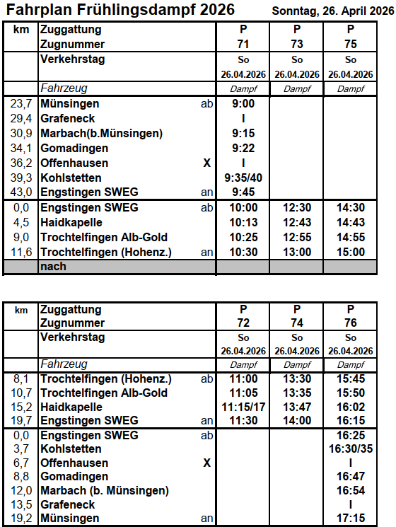 Fahrkarten können bis einen Tag vor der Veranstaltung online gebucht werden. Resttickets erhalten Sie am Fahrtag am Fahrkartenschalter in Münsingen, oder bei Zustieg in Engstingen und Trochtelfingen beim Zugpersonal.